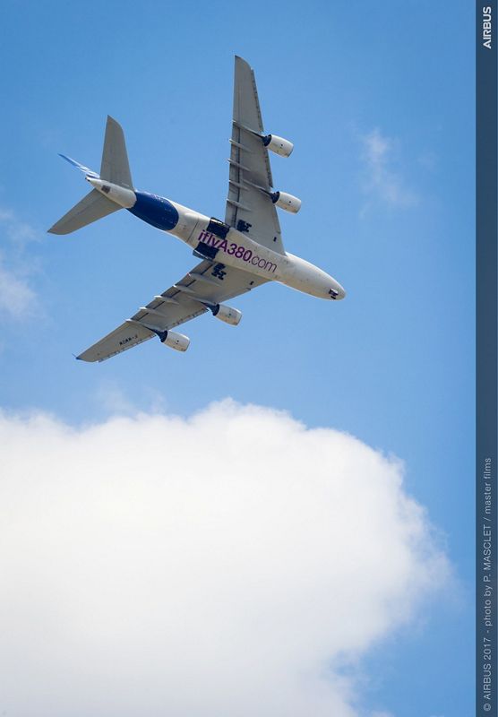 The double-deck widebody Airbus A380 jetliner – designed for 21st century air traffic growth – showcases its flight capabilities at the 2017 Paris Air Show.