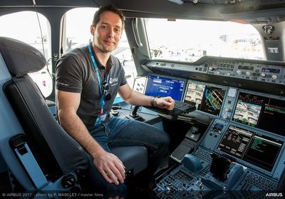 Thomas Pesquet, French aerospace engineer, pilot and European Space Agency astronaut, visits the A350-1000's cockpit during the 2017 Paris Air Show.