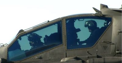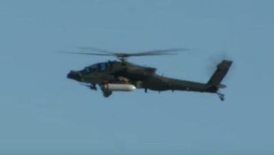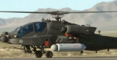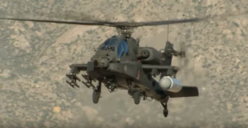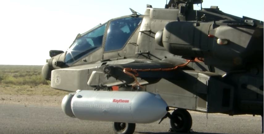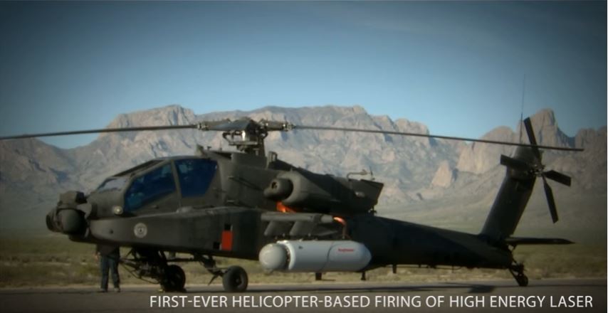 Raytheon, in partnership with the U.S. Army and U.S. Special Operations Command, mounted a high energy laser on an Apache helicopter similar to those in this image and engaged and fired on a target at White Sands Missile Range.