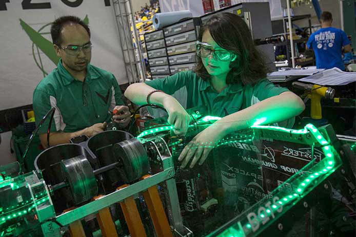 A Raytheon-sponsored team, The Vitruvian Bots, prepares for a competition-filled weekend at the FIRST Robotics Los Angeles Regionals.
