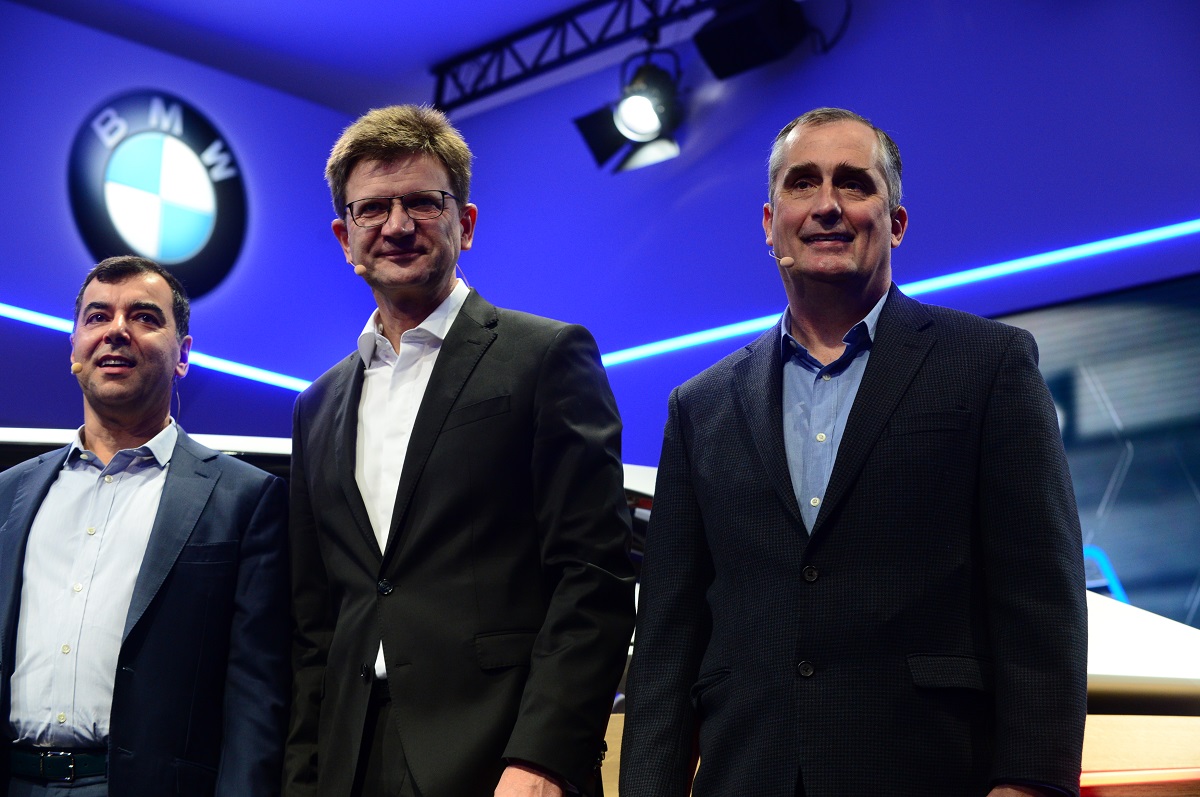 Mobileye co-founder Amnon Shashua (from left), Klaus Fröhlich of BMW Group and Intel CEO Brian Krzanich stand in front of a BMW prototype at the BMW Group news conference.