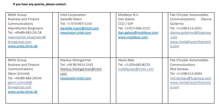 BMW Group, Intel, Mobileye and FCA, together with the recently announced development partners and system integrators, invite and welcome additional automakers and technology suppliers to join them in adopting this autonomous driving platform in an effort to create an industry-wide solution.