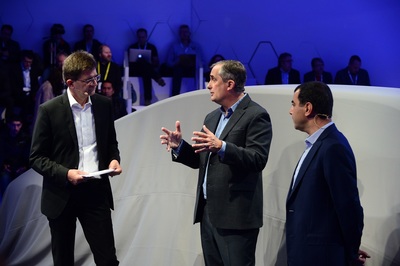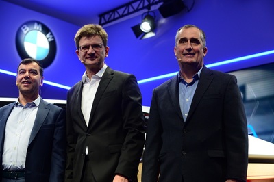 Klaus Fröhlich of BMW Group (from left), Intel CEO Brian Krzanich and Mobileye co-founder Amnon Shashua speak at the BMW Group news conference.