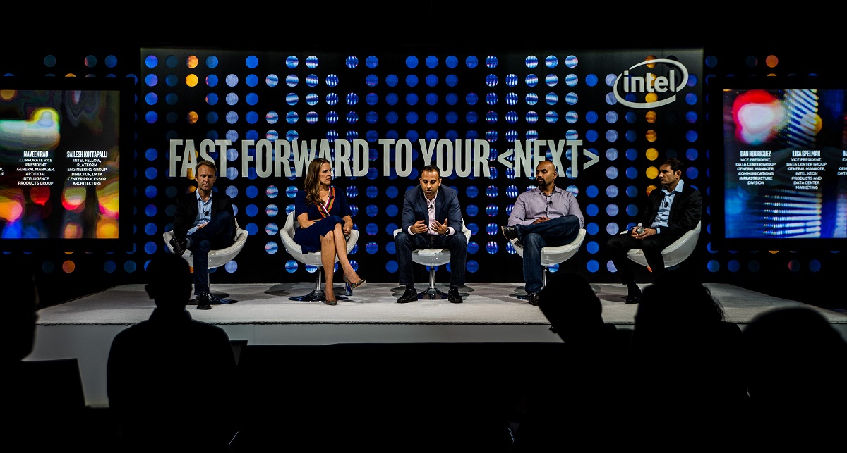 From left: Intel’s Dan Rodriguez, Lisa Spelman, Navin Shenoy, Naveen Rao and Sailesh Kottapalli speak during an investor roundtable for Intel Xeon Scalable processors.