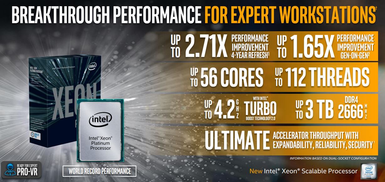 Unveiled in July 2017, Intel Xeon Scalable processors deliver breakthrough dual-socket performance for the most advanced workstation professionals, offering up to 56 cores, up to 112 threads and an Intel® Turbo Boost Technology frequency up to 4.2 GHz.