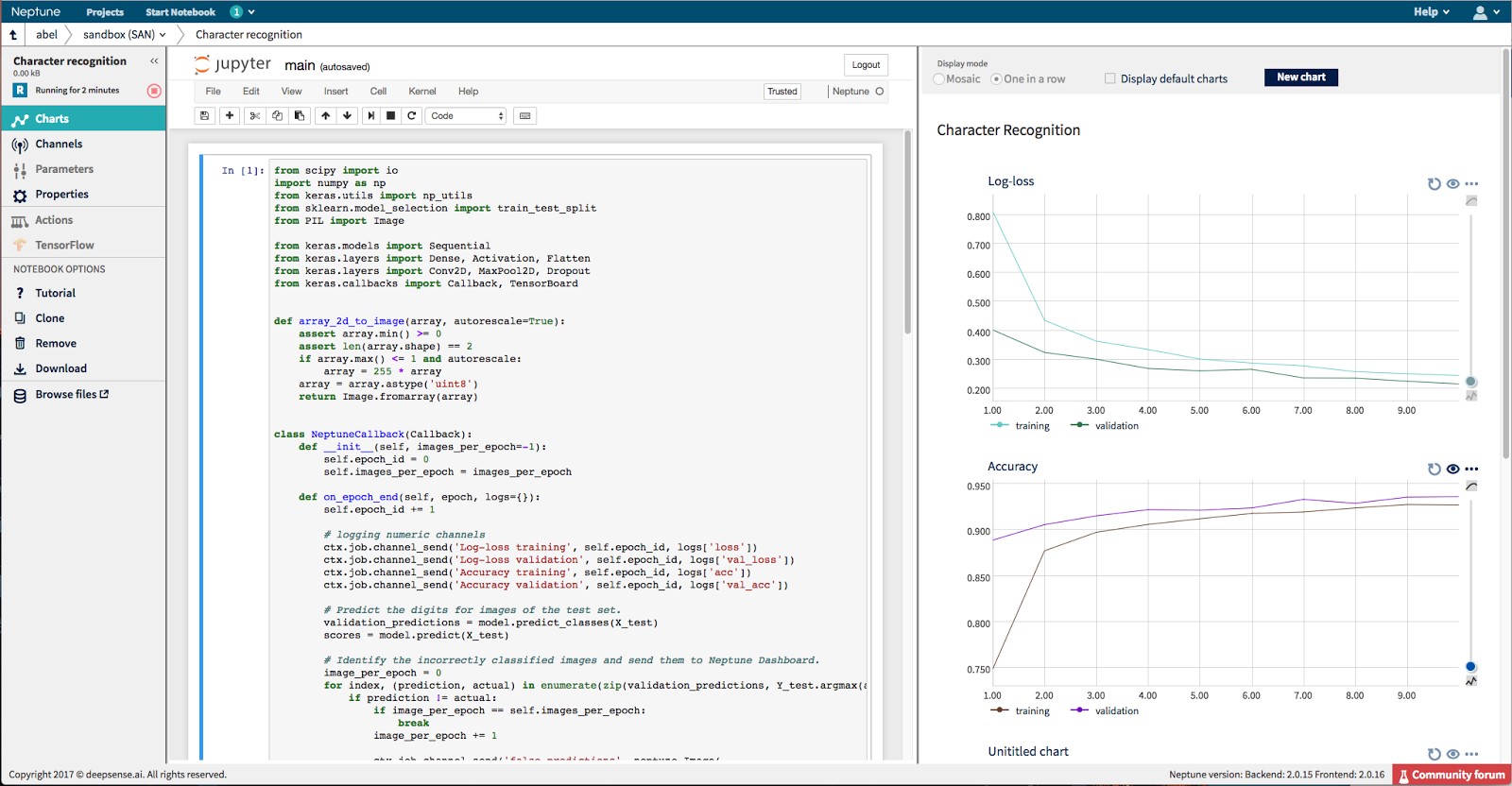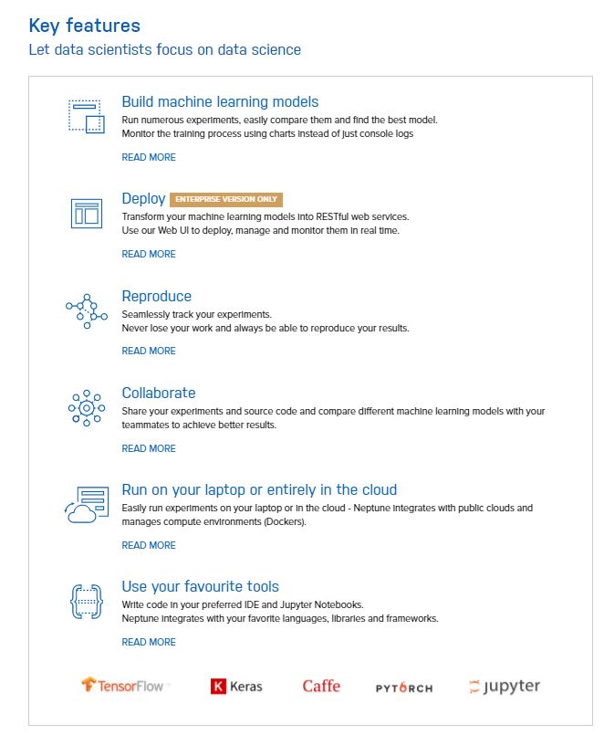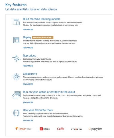 Neptune minimizes time-consuming, complex technology stack and infrastructure management and allows data scientists to choose frameworks they prefer, including Keras, Tensorflow, Pytorch and others.