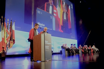 Prof. Leon Laulusa, Dean for Academic Affairs and International Relations ESCP Europe in his speech pointed out to accomplishments of Kozminski University, established by Professor Koźmiński (and named after his late father) that is widely recognized as the best business school in Central Europe, with numerous international scholars and students, and outstanding research conducted in multi-cultural teams.