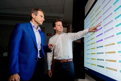John Kahan, left, and Juan Lavista Ferres, look over some of the SIDS-related correlations generated by the research tool developed by Microsoft volunteers.