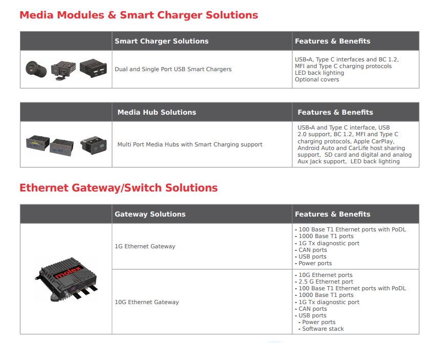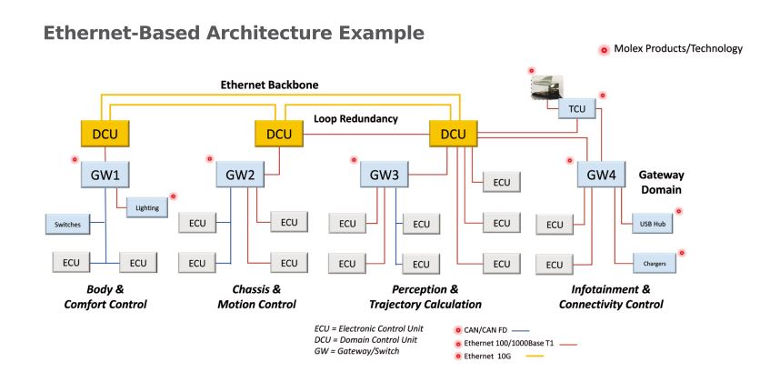 The Molex 10 Gbps Ethernet Automotive Network features secure over-the-air software and firmware updates and diagnostics over IP (DoIP) to help avoid the need for vehicle recalls and enabling in-vehicle security and diagnostics over IP.