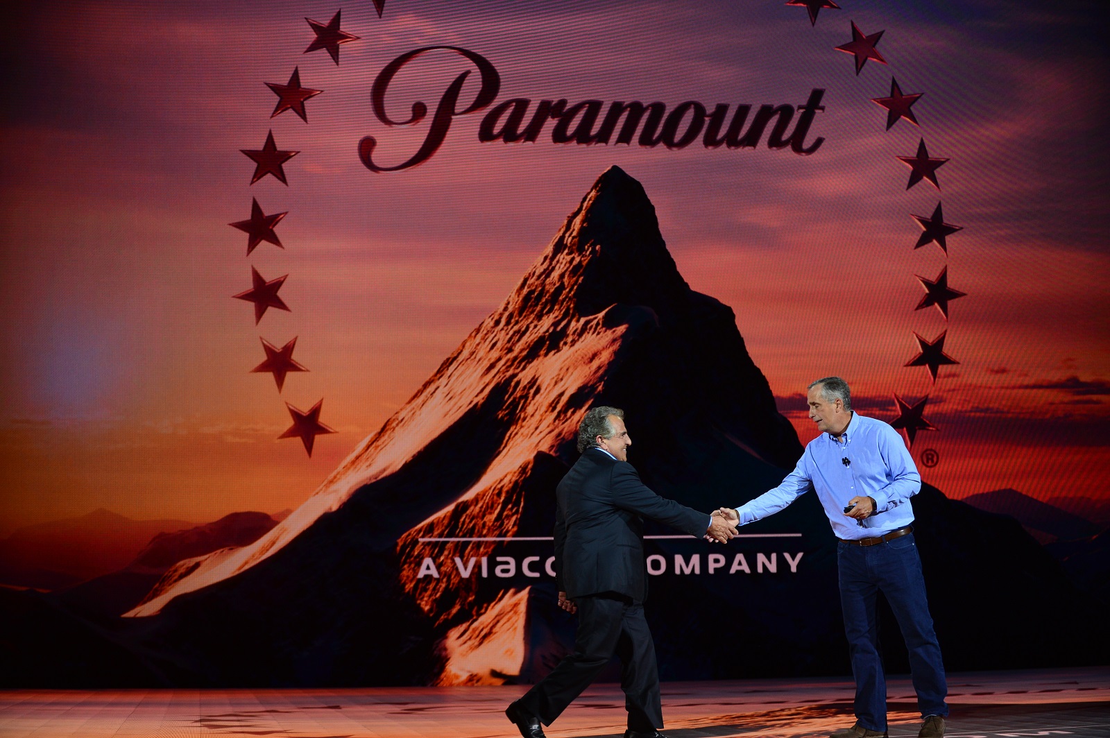 Jim Gianopulos (left), chairman and CEO of Paramount Pictures, joins Brian Krzanich, Intel Corporation chief executive officer, on stage during the 2018 Consumer Electronics Show (CES) preshow keynote address on Monday, Jan. 8, 2018, in Las Vegas.