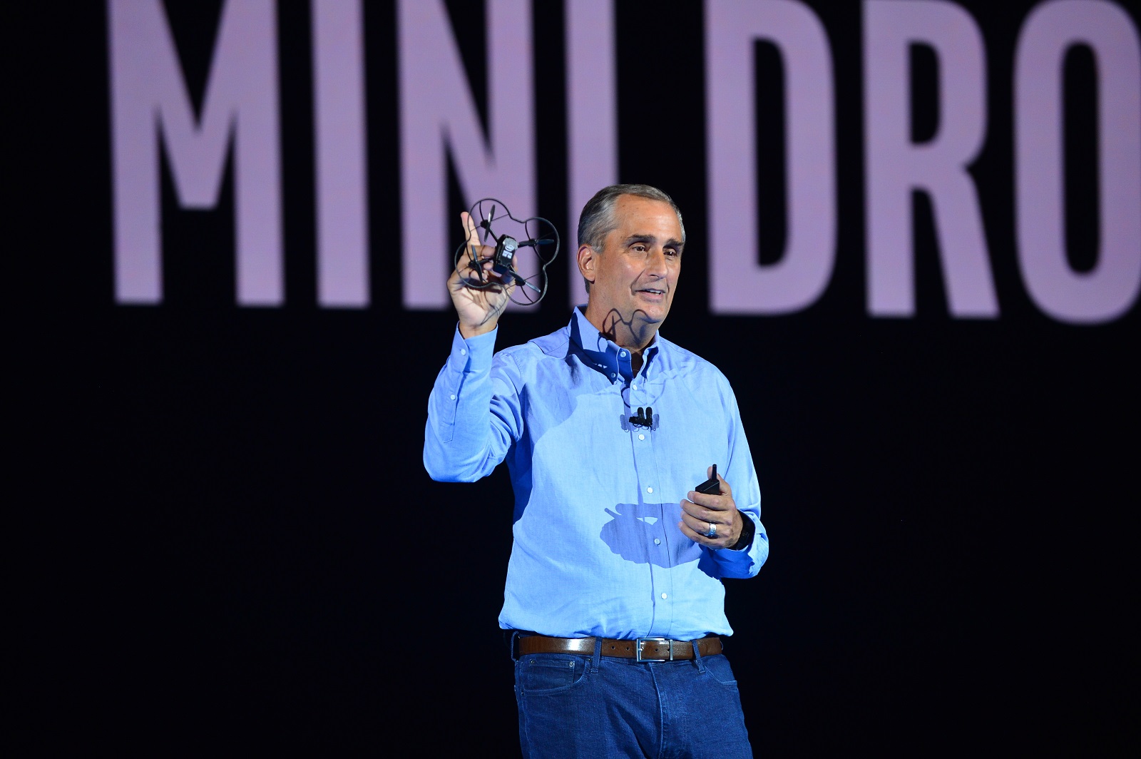 Brian Krzanich, Intel Corporation chief executive officer, displays a Shooting Star Mini drone during the 2018 Consumer Electronics Show (CES) preshow keynote address on Monday, Jan. 8, 2018, in Las Vegas.