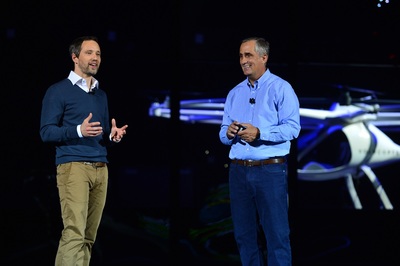 Florian Reuter (left), CEO of Volocopter, joins Brian Krzanich, Intel Corporation chief executive officer, on stage during the preshow keynote at the 2018 Consumer Electronics Show (CES) on Monday, Jan. 8, 2018, in Las Vegas.
