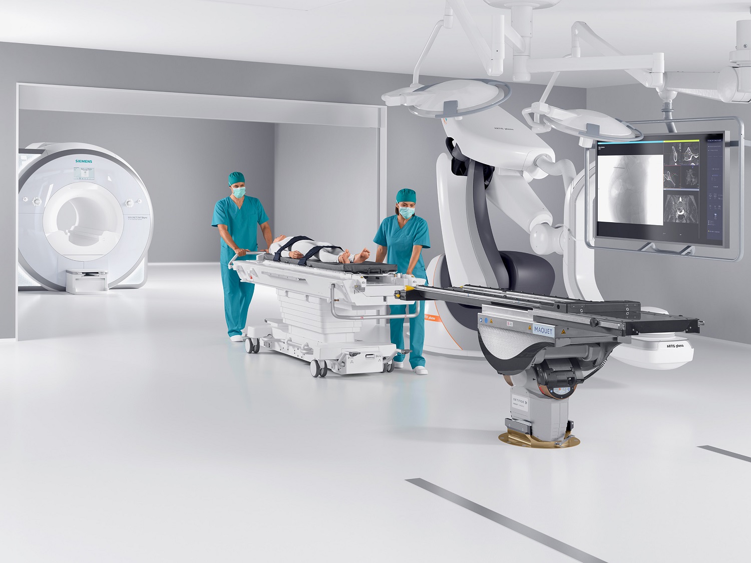 In the area of surgical procedures, nexaris Angio-MR-CT can be used to combine the robot-supported angiography system Artis pheno, the MR systems Magnetom Aera and Skyra, and Somatom CT Sliding Gantry systems to form a multi-room solution.