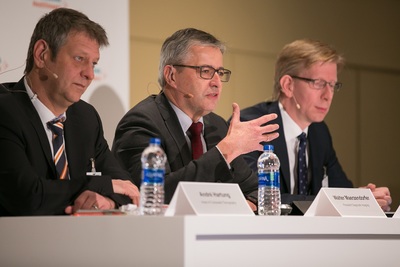 Speakers at the at this year's Annual Meeting of the Radiological Society of North America (RSNA) in Chicago, USA (from left): André Hartung, Head of Computed Tomography, Siemens Healthineers; Walter Maerzendorfer, President Diagnostic Imaging, Siemens Healthineers; Peter Seitz, Head of Surgery, Siemens Healthineers.