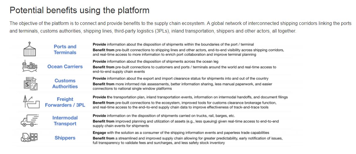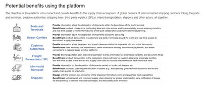 Since then, multiple parties have piloted the platform including DuPont, Dow Chemical, Tetra Pak, Port Houston, Rotterdam Port Community System Portbase, the Customs Administration of the Netherlands, U.S. Customs and Border Protection.
