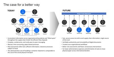 By applying the technology to digitize global trade processes, a new form of command and consent can be introduced into the flow of information, empowering multiple trading partners to collaborate and establishing a single shared view of a transaction without compromising details, privacy or confidentiality.