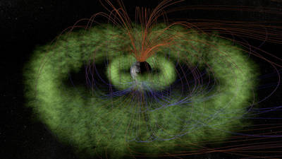 The Van Allen Belts, shown in green in this illustration, are concentric doughnut-shaped belts filled with charged particles, trapped by Earth’s magnetic field.