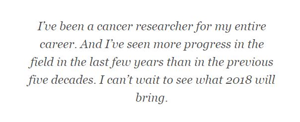 As 2018 kicks off, my colleagues and I are keeping a close eye on a few promising areas of cancer research and treatment — and of course, doing our part to help usher in these advances as swiftly as we can