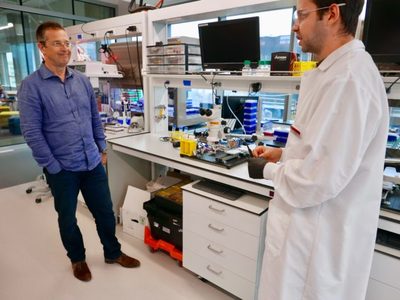 Juno CEO Hans Bishop (left) speaking to VP of Research and Receptor Discovery Francois Vigneault inside his lab.