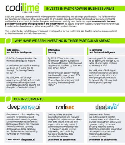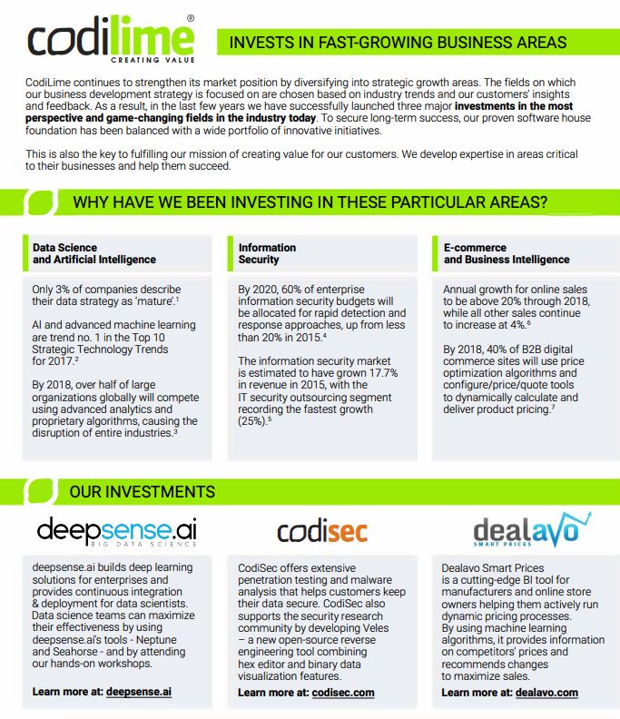 deepsense.ai is founded and managed by CodiLime, an IT consulting and software engineering company providing professional services for global clients in three core areas: Networks, Security and Big Data & Data Science.
