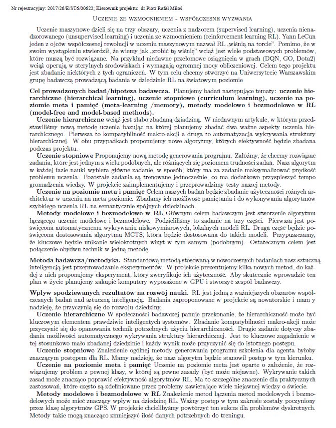 The project “Reinforcement Learning - contemporary challenges” is designed to help resolve long-standing open problems in training robots and game agents in difficult environments.
