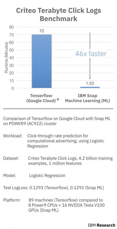 Las Vegas, Nevada and Armonk, N.Y., USA - March 20, 2018 - IBM has demonstrated a new breakthrough in AI performance. By using machine learning on POWER9 with NVIDIA Tesla V100 GPUs, IBM technology can now predict the likelihood of a user clicking online advertisements 46x faster than previous published results. In a newly published benchmark by IBM Research, we demonstrated how Snap Machine Learning (AI technology) can be used to train machine learning models for massive data sets from financial records to weather forecasting to online marketing.