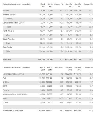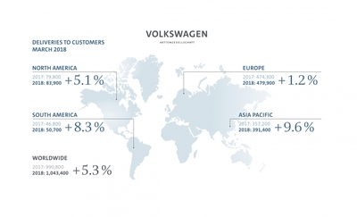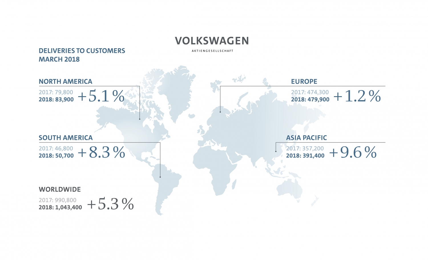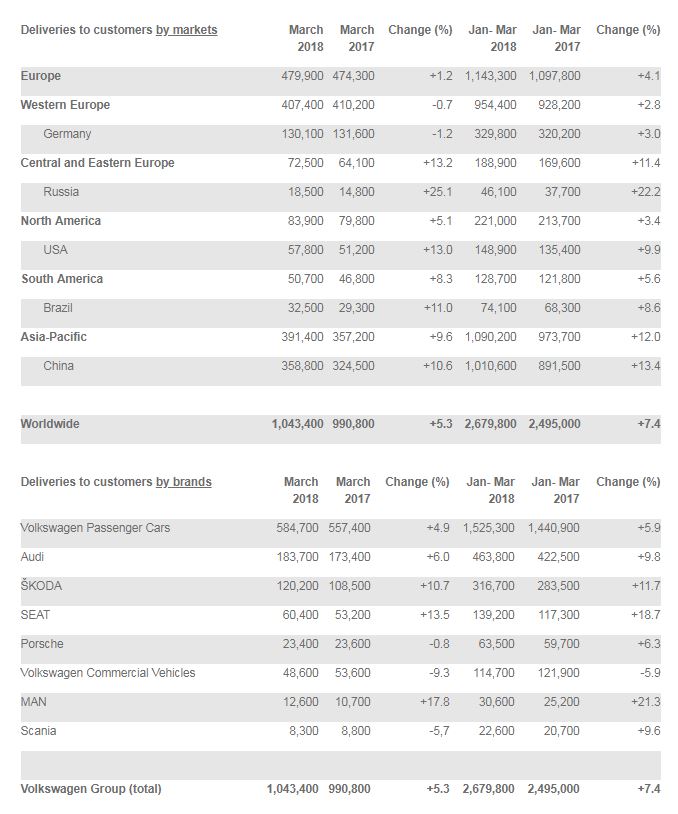 Volkswagen Group delivers over 1 million vehicles in March 2018.