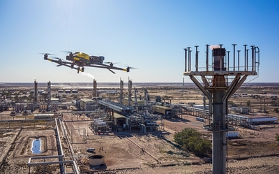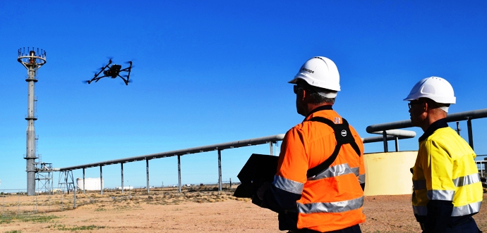 The Intel Falcon 8+ drone inspects Santos’s Moomba hydrocarbon processing facility in Australia’s Cooper Basin.