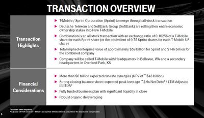 Bellevue, Washington and Overland Park, Kansas, USA - April 29, 2018 - T-Mobile US (NASDAQ: TMUS) and Sprint Corporation (NYSE: S) today announced they have entered into a definitive agreement to merge in an all-stock transaction at a fixed exchange ratio of 0.10256 T-Mobile shares for each Sprint share or the equivalent of 9.75 Sprint shares for each T-Mobile US share. Based on closing share prices on April 27, this represents a total implied enterprise value of approximately USD59 billion for Sprint and approximately USD146 billion for the combined company. The new company will have a strong closing balance sheet and a fully funded business plan with a strong foundation of secured investment grade debt at close.