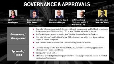 The Board will consist of 14 directors, 9 nominated by Deutsche Telekom and 4 nominated by SoftBank Group, including Masayoshi Son, Chairman and CEO of SoftBank Group, and Marcelo Claure, CEO of Sprint.