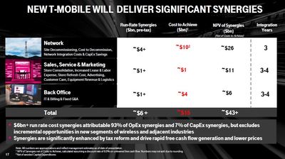 The combination of spectrum holdings, resulting network scale, and expected run rate cost synergies of $6+ billion, representing a net present value (NPV) of $43+ billion will supercharge T-Mobile’s Un-carrier strategy to disrupt the marketplace and lay the foundation for U.S. companies and innovators to lead in the 5G era.