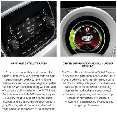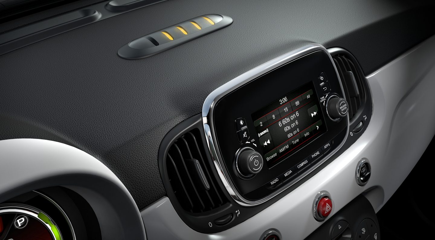 Between the enhanced graphics of the 500e premium 7-inch Thin Film Transistor (TFT) display (right) and the Uconnect® 5-inch touchscreen radio (below), you can count on up-to-the-minute vehicle intel as well as the very latest music and news from the world at large.